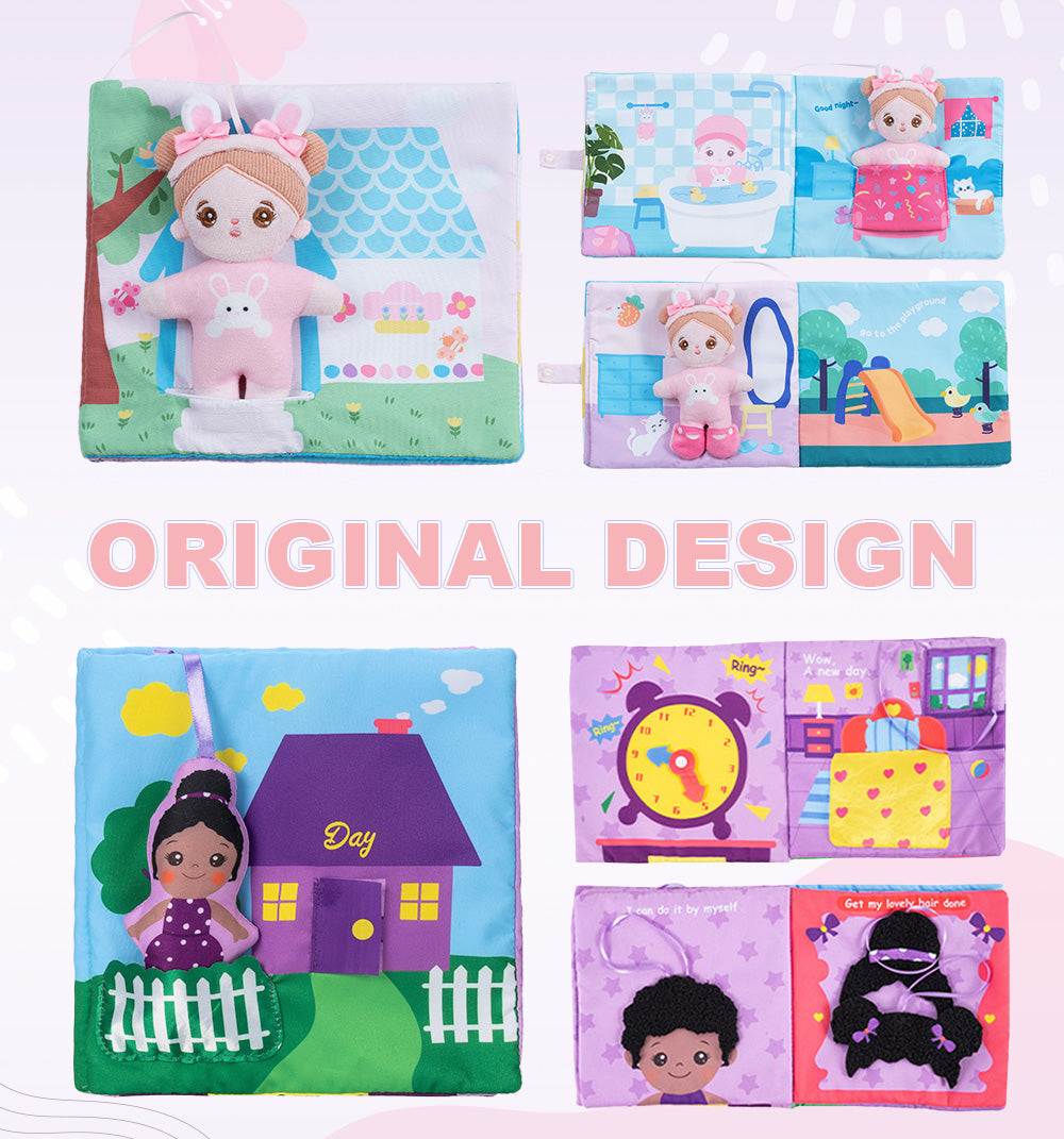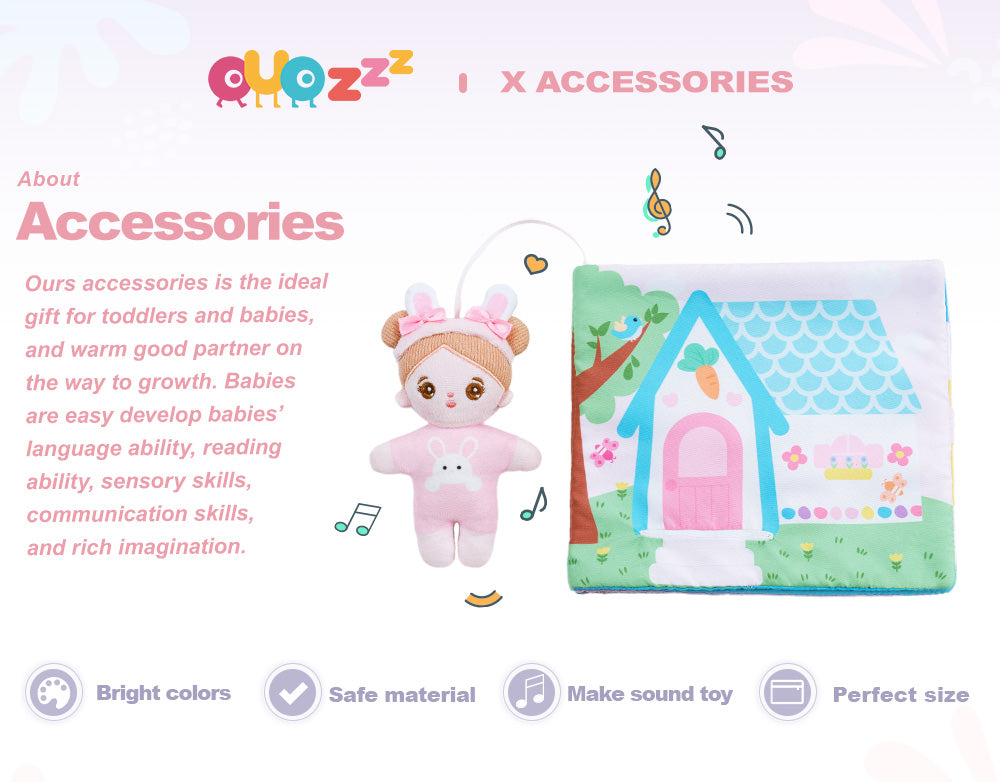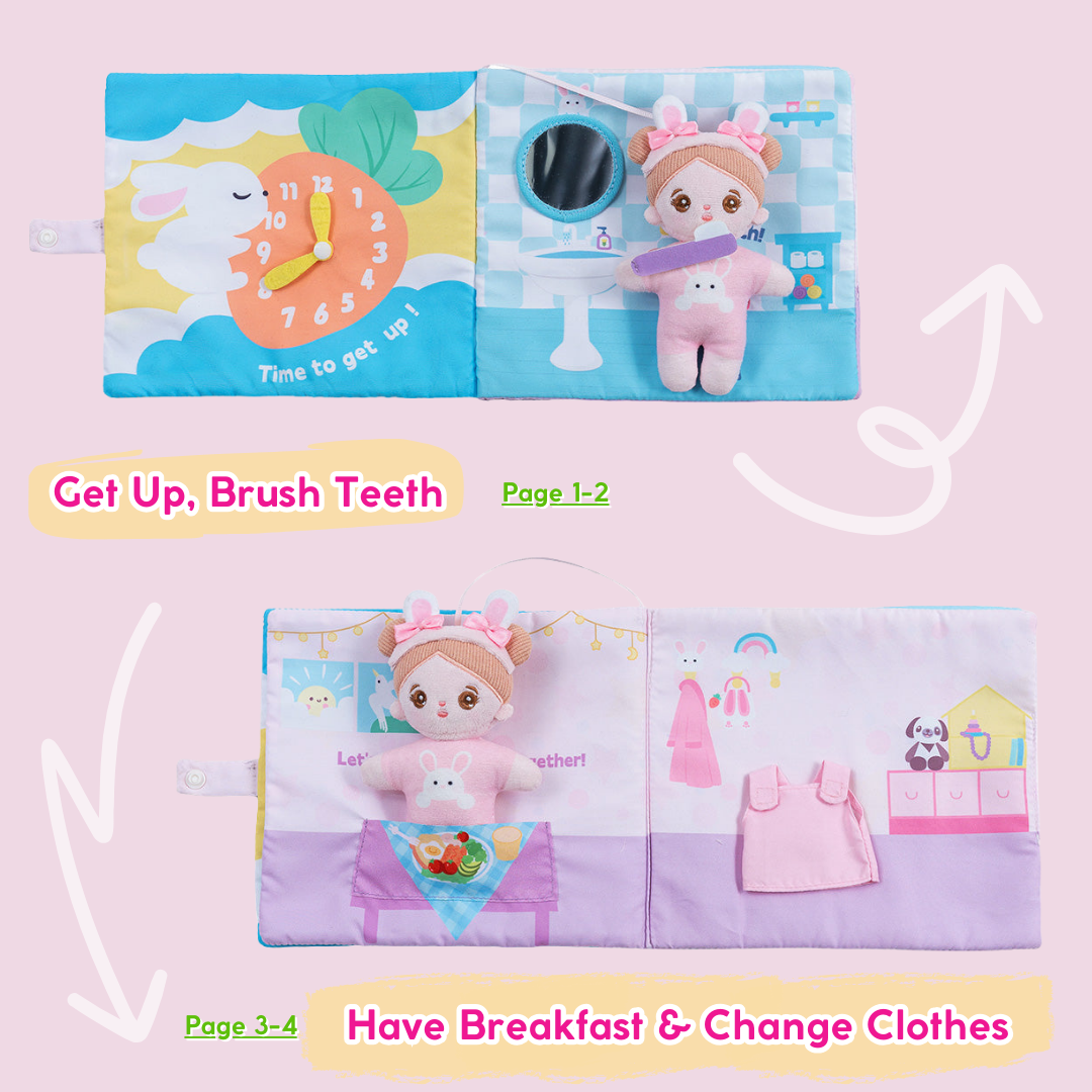 This interactive cloth book has a total of 8 pages, including 8 common life scenes and a squeaky bunny doll.