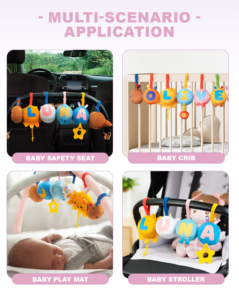 strollers and other baby's main activity venues, to keep babies engaged, entertained and soothed.