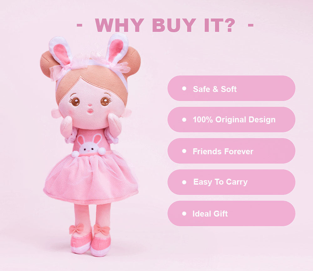 Our dolls are made of high-quality A-grade fabrics, which are super soft, safe, non-toxic, sensitive-skin-friendly, machine washable.
