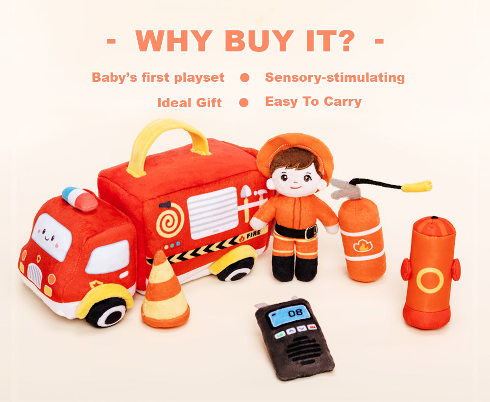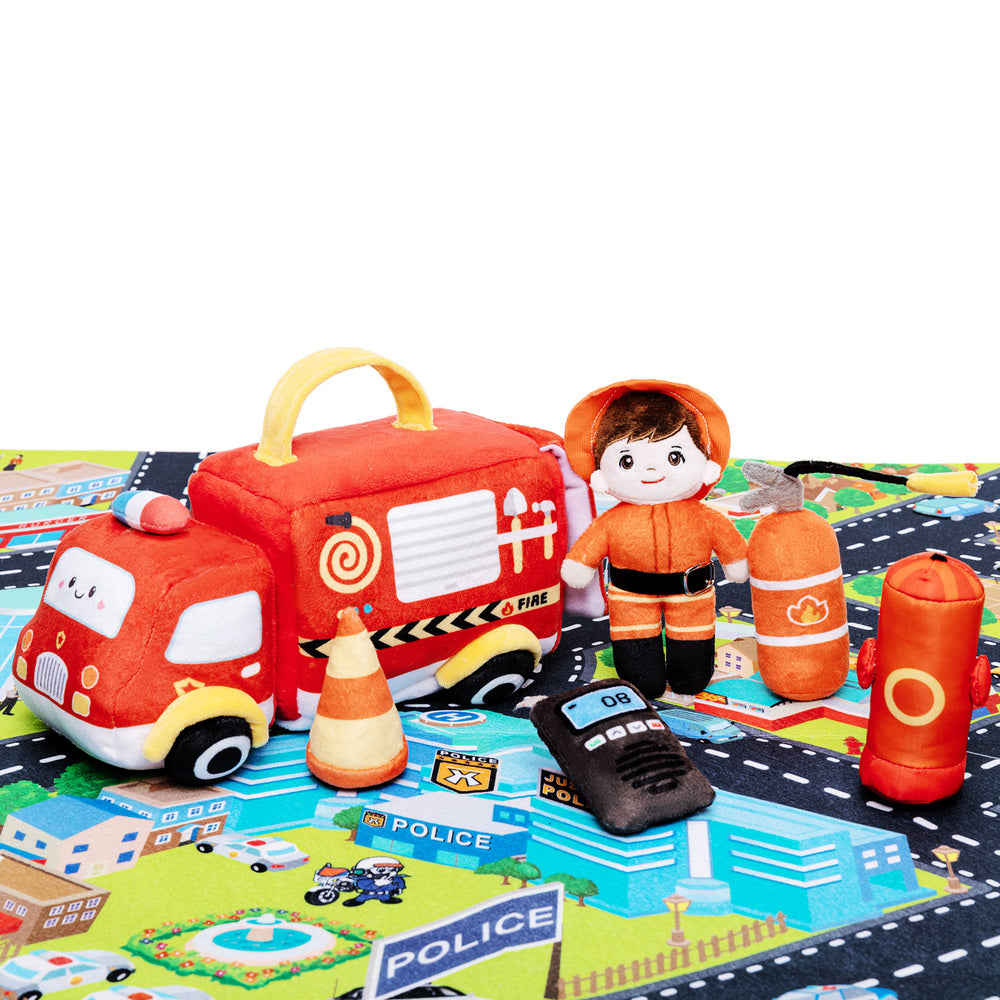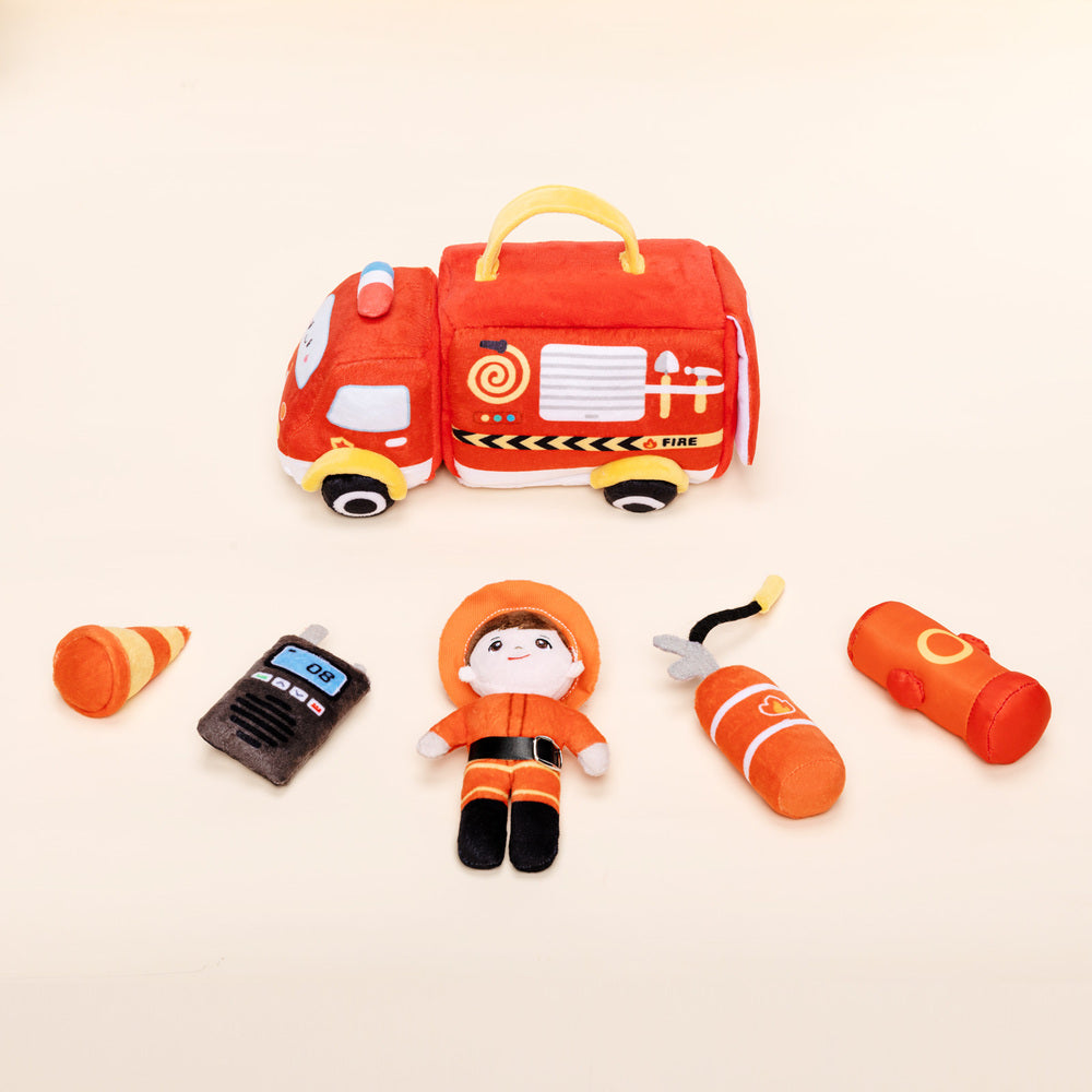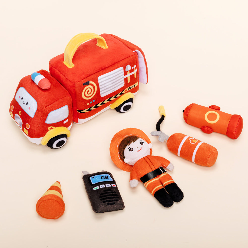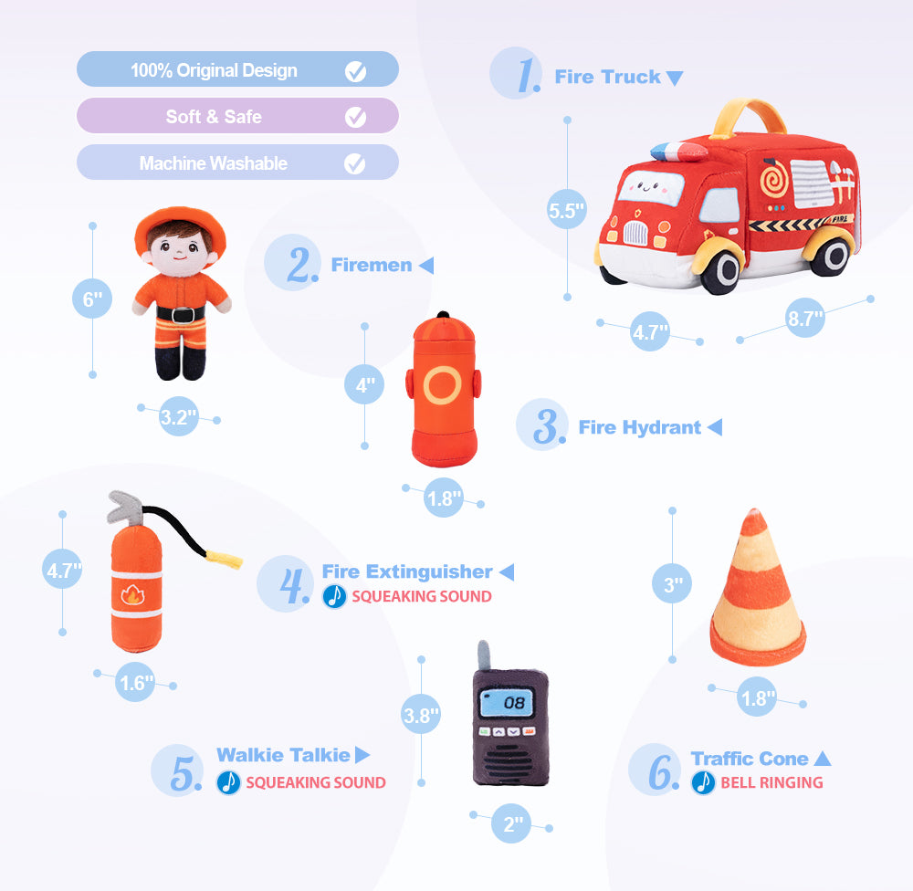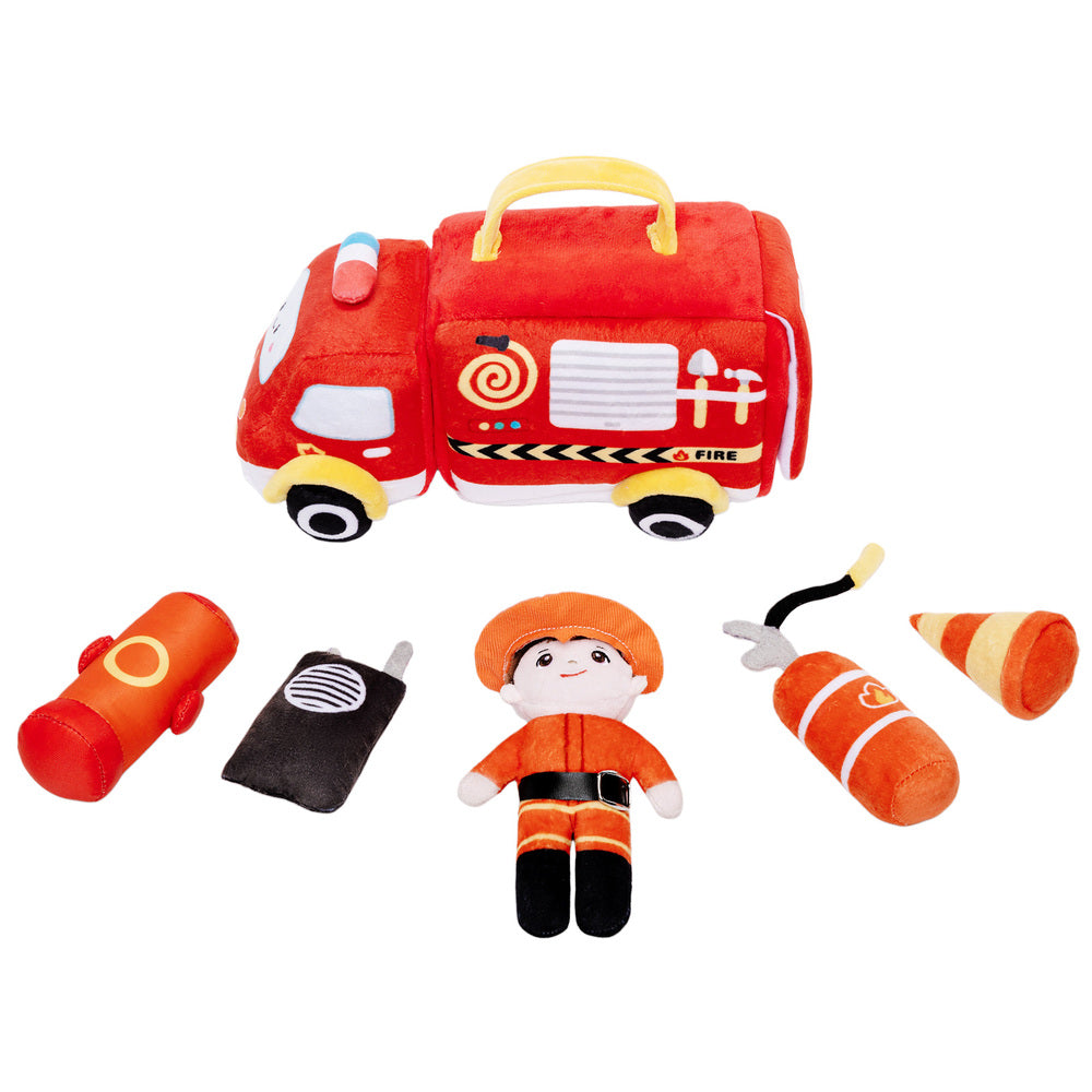This soft playset features a 8.7" plush box to store 5 soft toys: a little firemen doll; a squeaker fire extinguisher; a squeaker Walkie Talkie; a traffic cone sound toy and a plush fire hydrant.