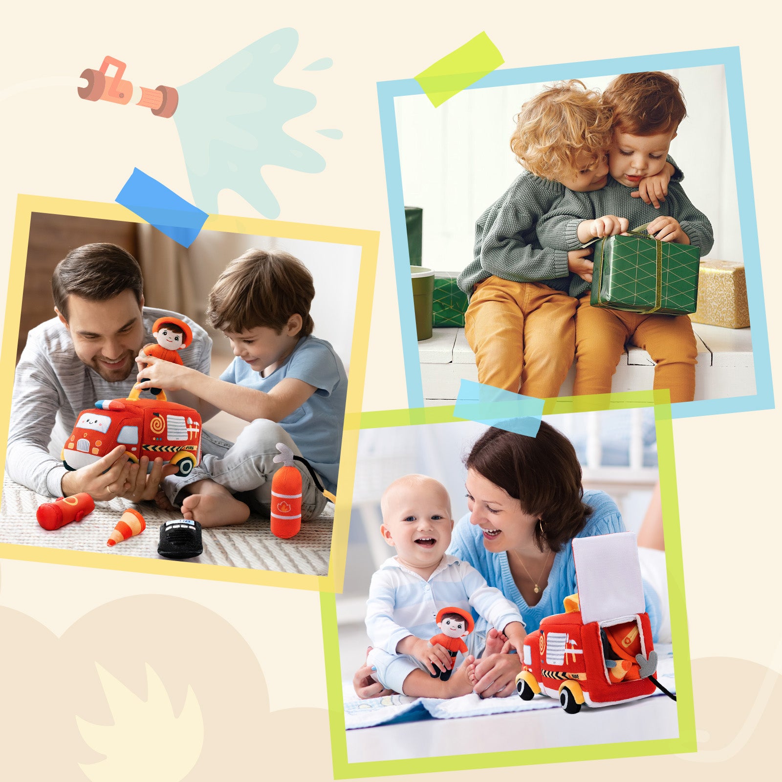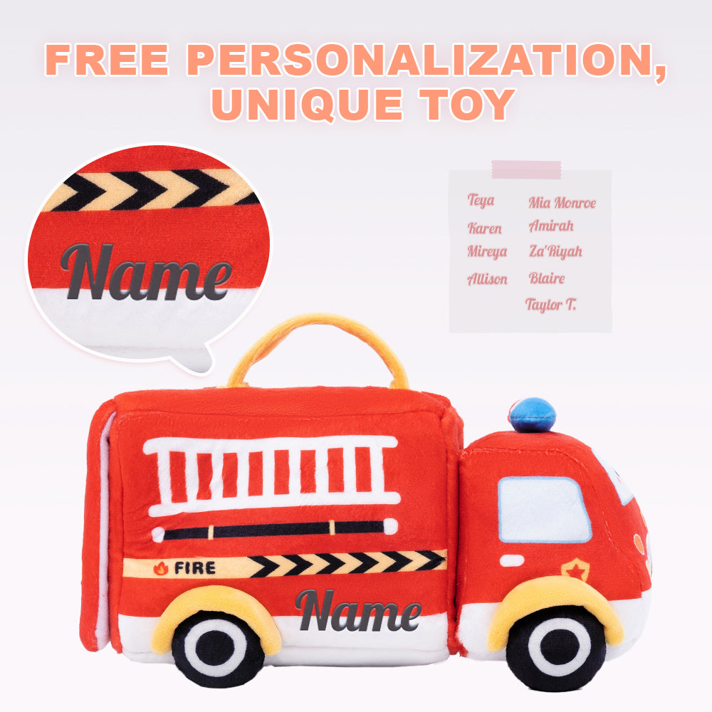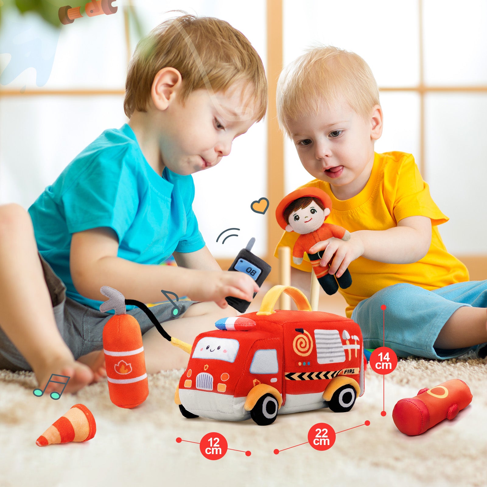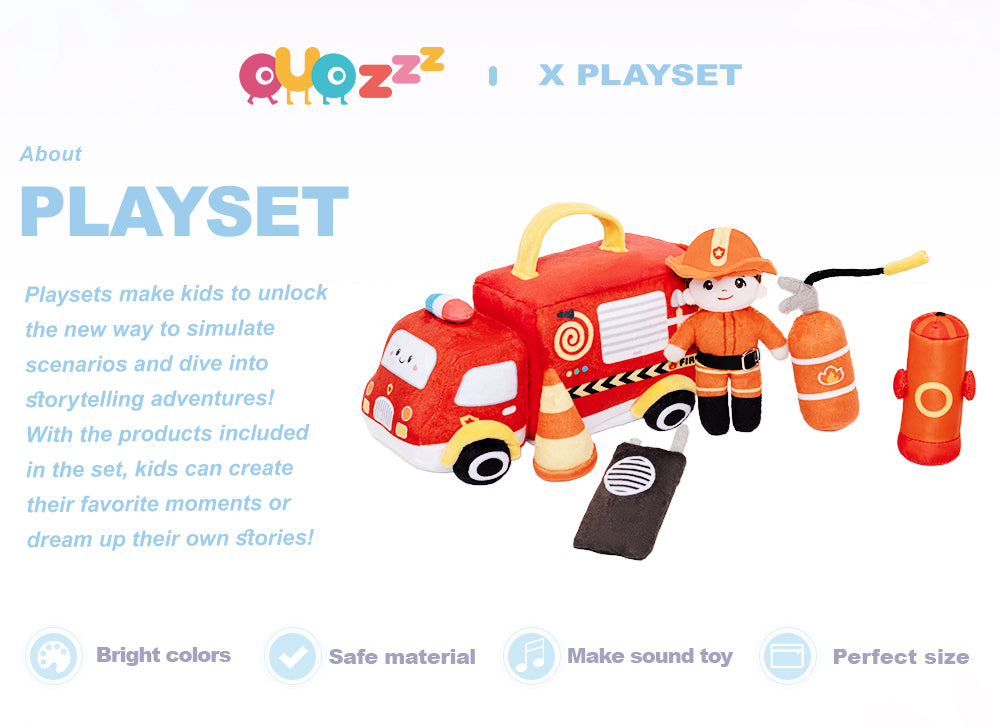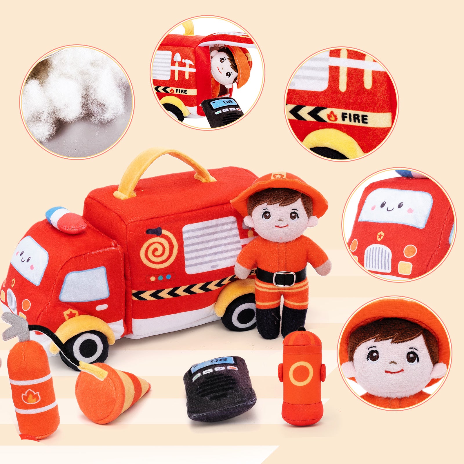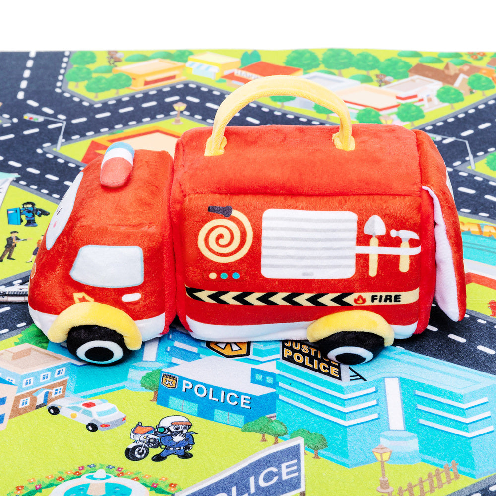 This soft playset features a 8.7" plush box to store 5 soft toys: a little firemen doll; a squeaker fire extinguisher; a squeaker Walkie Talkie; a traffic cone sound toy and a plush fire hydrant.