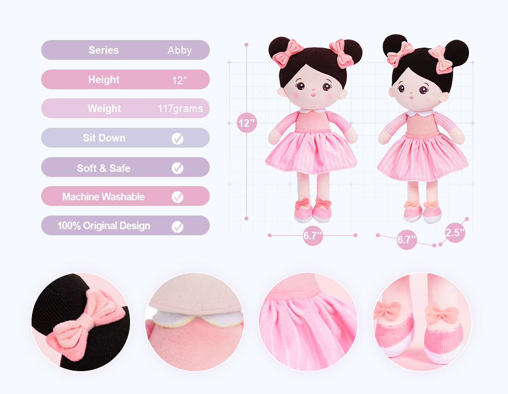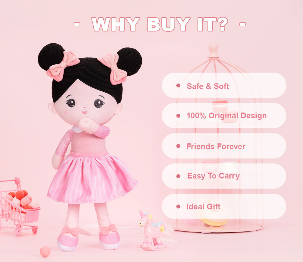 Our dolls are made of high-quality A-grade fabrics, which are super soft, safe, non-toxic, sensitive-skin-friendly, machine washable.