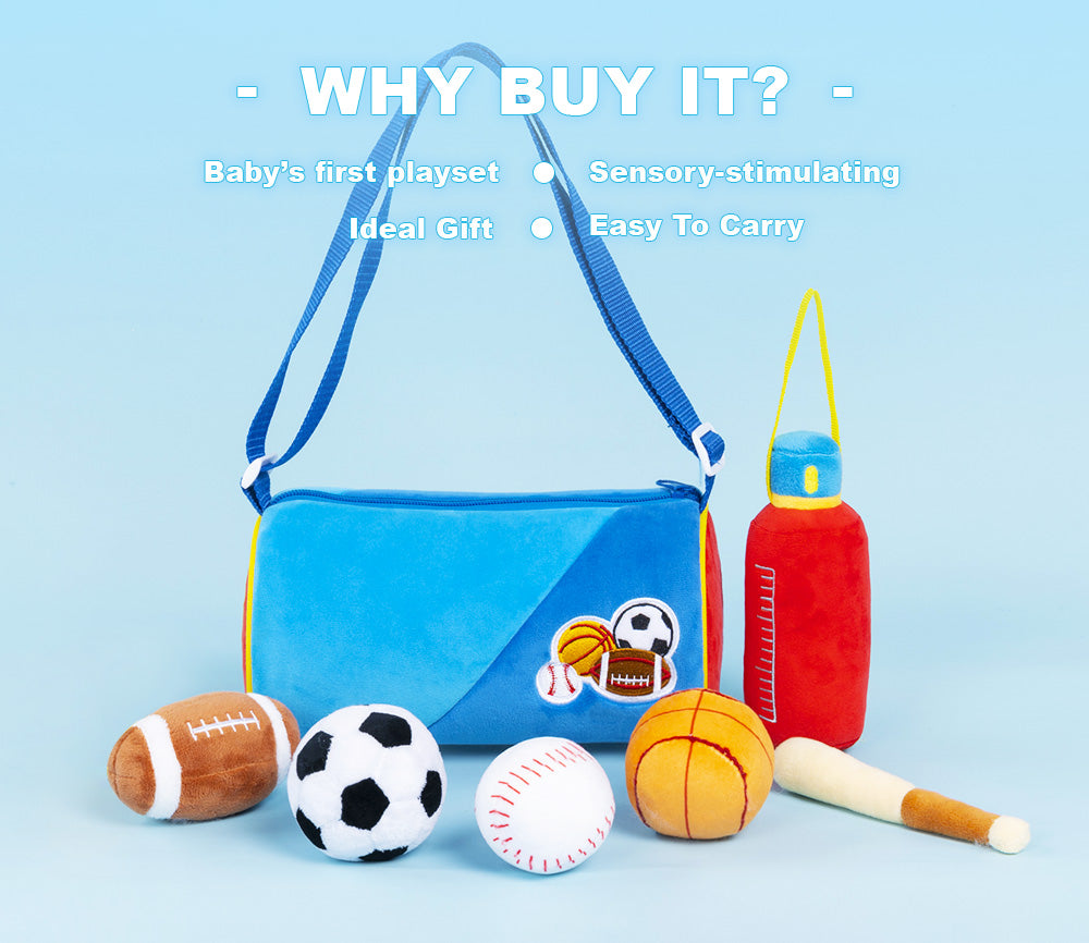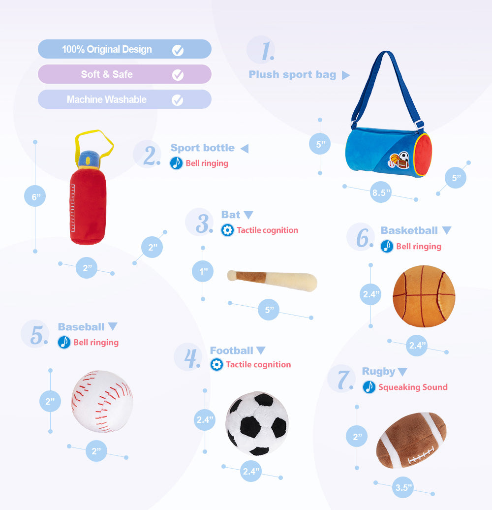 This soft playset features a 8.5" plush bag to store 6 soft toys: a bottle, a basketball, a baseball, are both built-in bell; a squeaker rugby; a football and a bat, both for tactile cognition. As they will be by our babies all time, the whole body of dolls are made with extreme soft material and no a single sharp object on it. The stitching is tight and strong in order to undertake our babies’ brandish of objects.