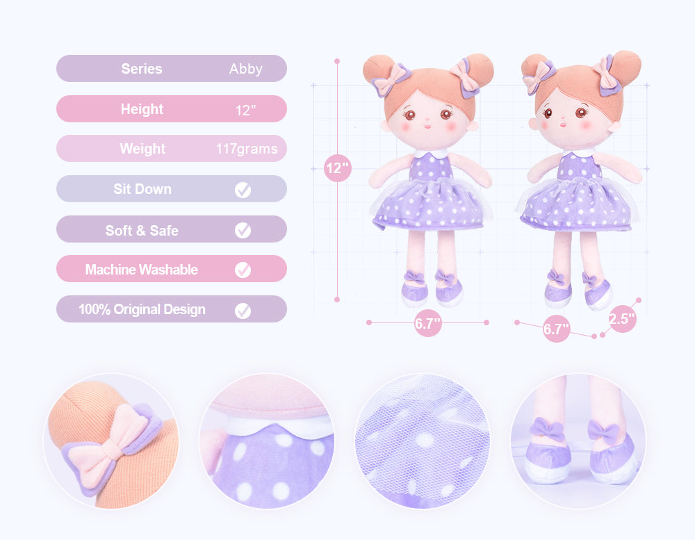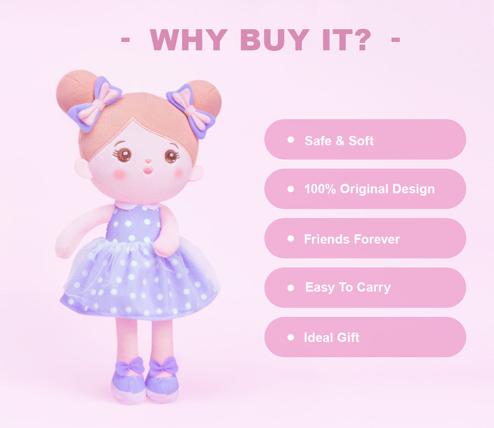 Our dolls are made of high-quality A-grade fabrics, which are super soft, safe, non-toxic, sensitive-skin-friendly, machine washable.