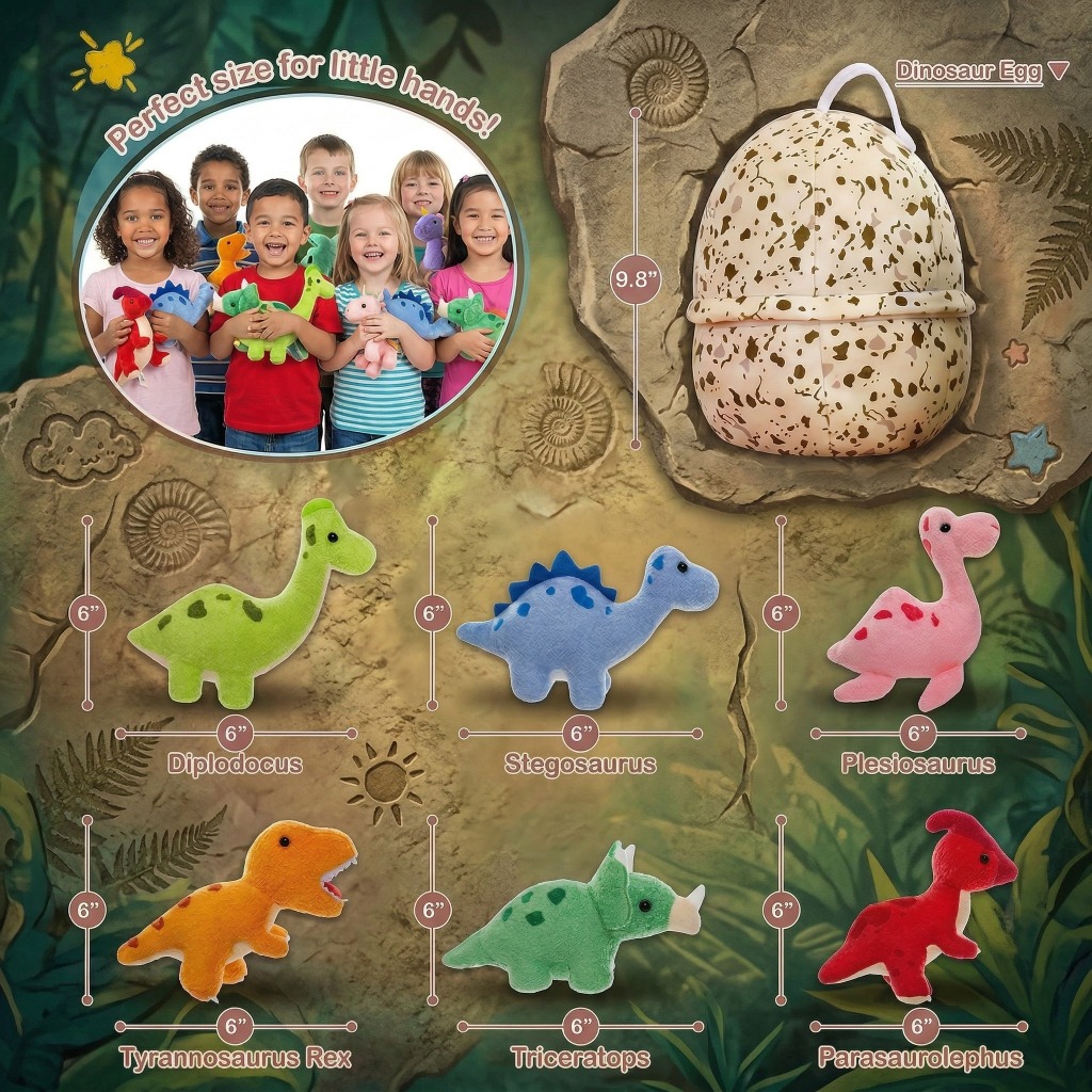 Pop open the cracked egg to discover not one, but six adorable plush dinosaurs! Each unique little dino is super soft and perfectly sized for tiny hands, ready to inspire epic tales and imaginative play.