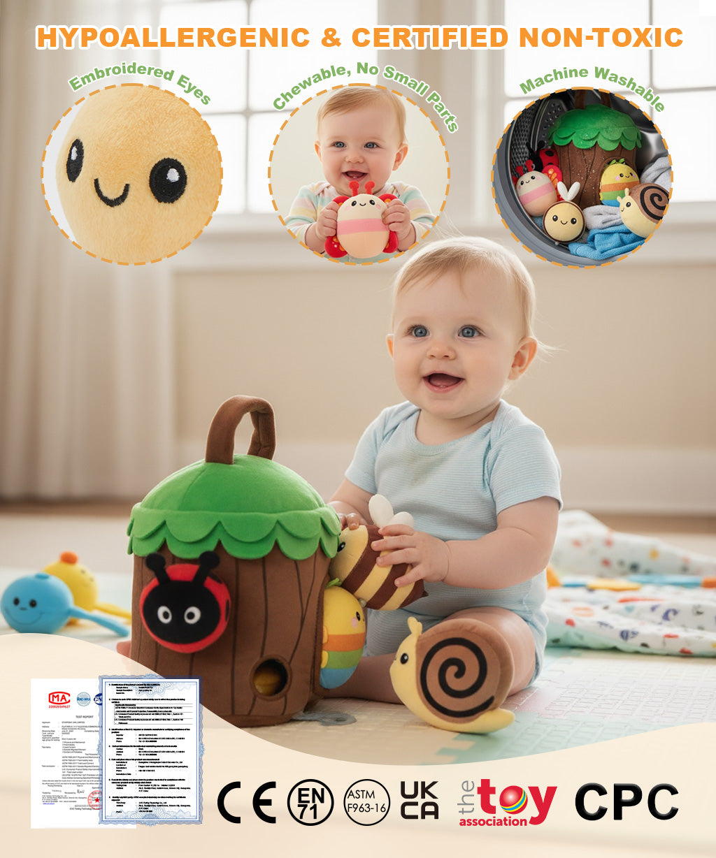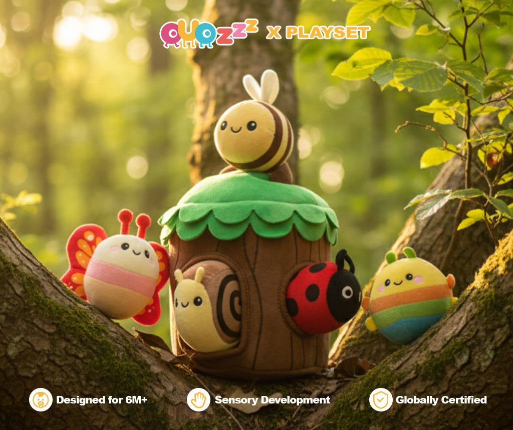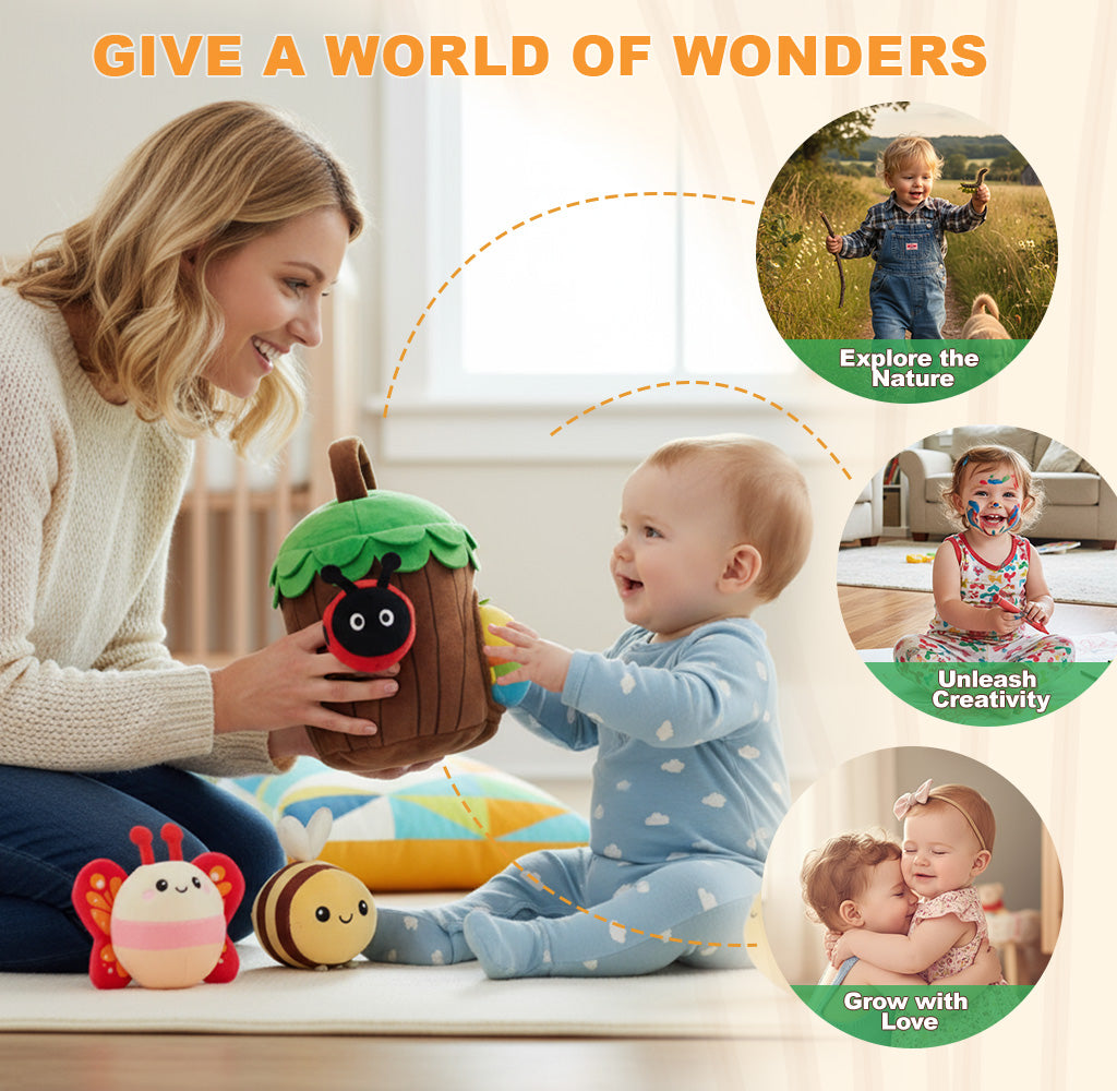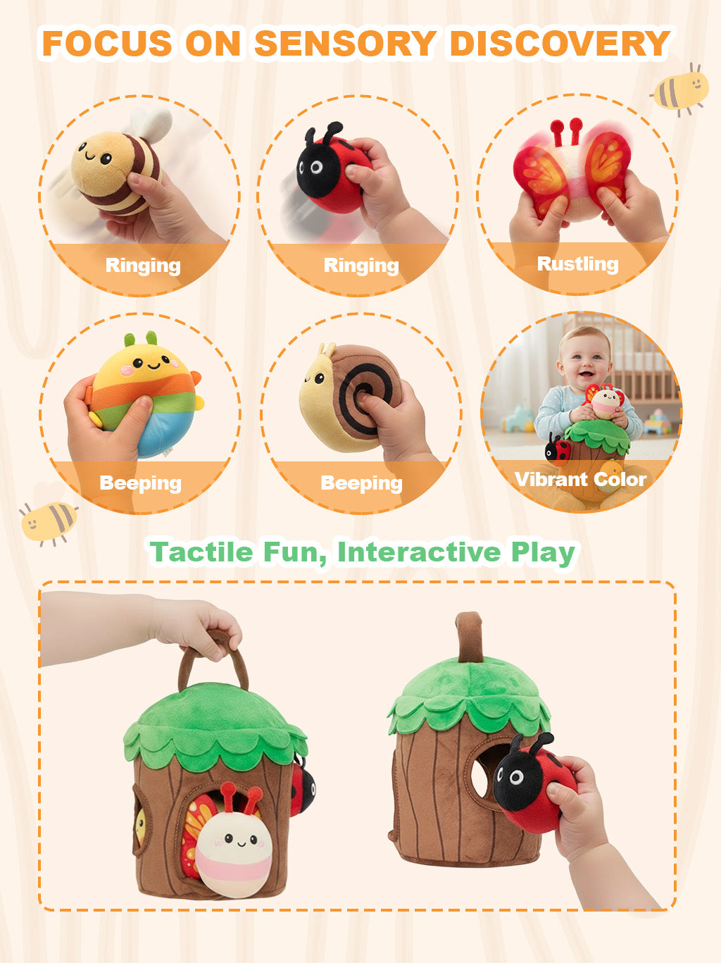 Meet the enchanting tree house and its 5 bug buddies! Expertly crafted to delight your baby's senses, support motor skills, and become their very first comforting companion.