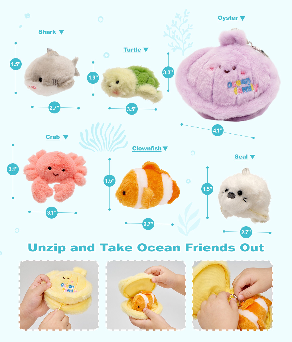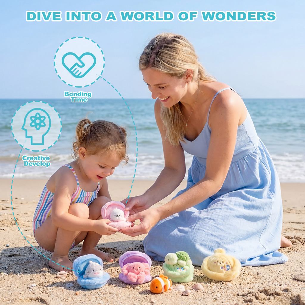 See how cute is this! Five adorable ocean friends nestled in a plush oyster, this set encourages imaginative play and joyful discovery through soft, creative companions.