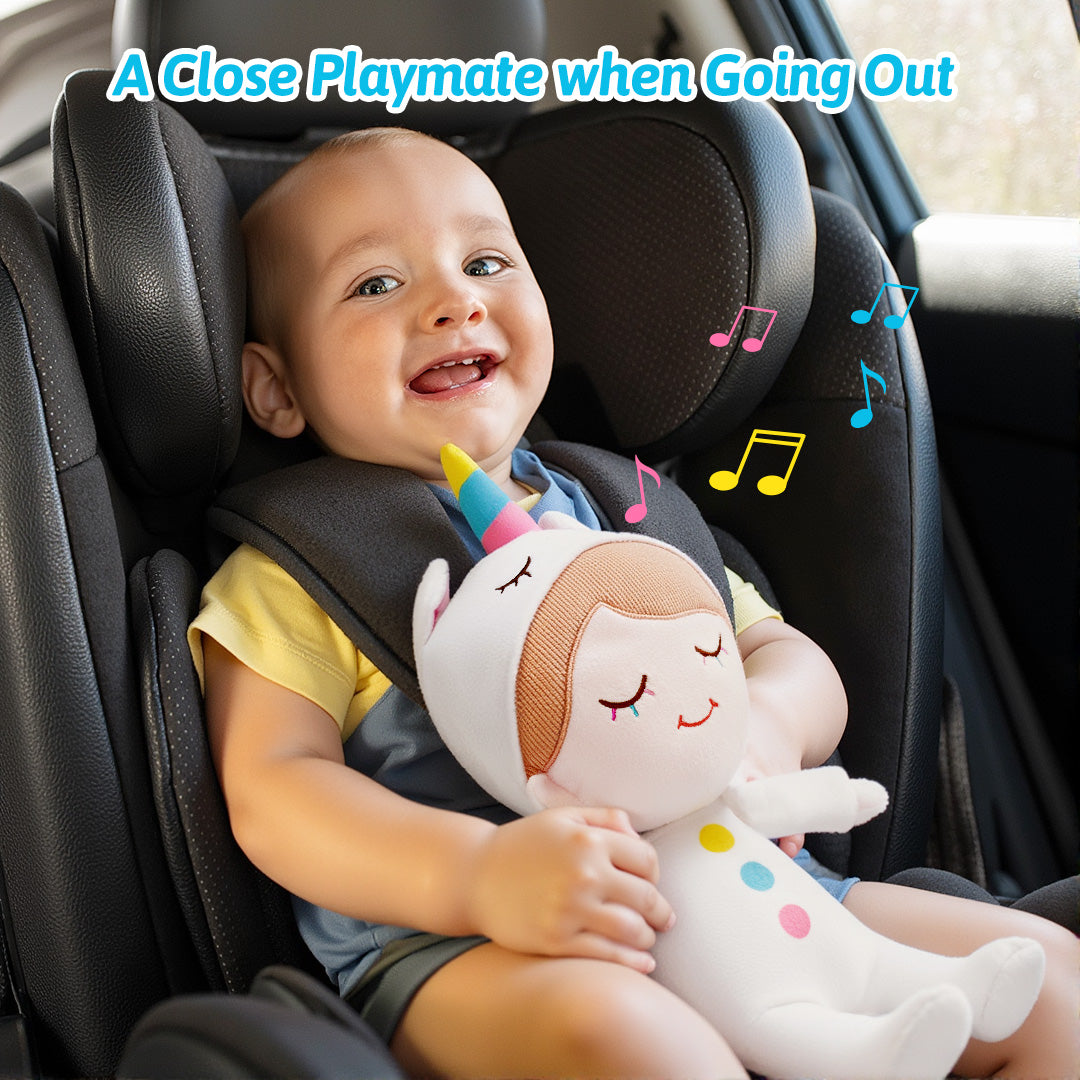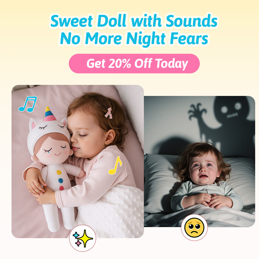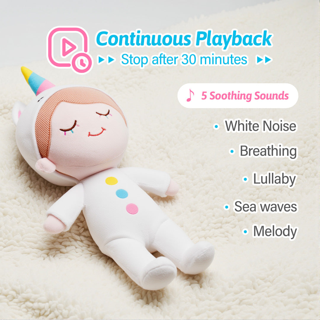The softest cuddle buddy, designed to bring peace and sweet dreams to your little one's bedtime. 🎵 5 Soothing Sounds: A symphony of calm for restless nights. ✨ Ultra-Soft Plush: Gentle on your baby's delicate skin. 🧼 Easy-Clean Design: For worry-free cuddles and play. 🔒 100% Baby-Safe: Because their safety is our top priority.