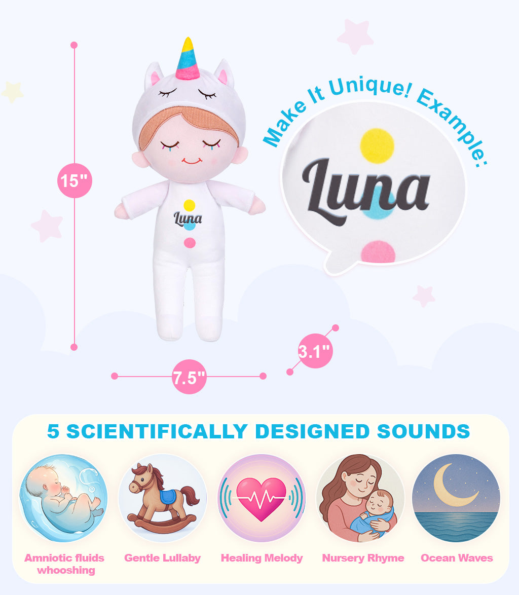 A Gift as Unique as They Are: Personalize your Uni with an embroidered name, turning a comforting buddy into a cherished, one-of-a-kind keepsake. Just the Right Size for Little Arms: At 15 inches (38cm), Uni is the perfect handful for your baby to hold, hug, and snuggle with all night long. The Sound of Sweet Dreams: From the familiar comfort of amniotic fluids whooshing to gentle lullabies, discover the perfect sound to lull your baby into a deep, peaceful slumber.