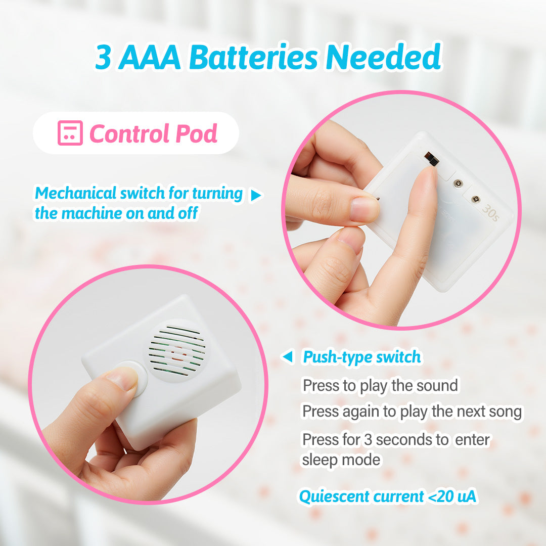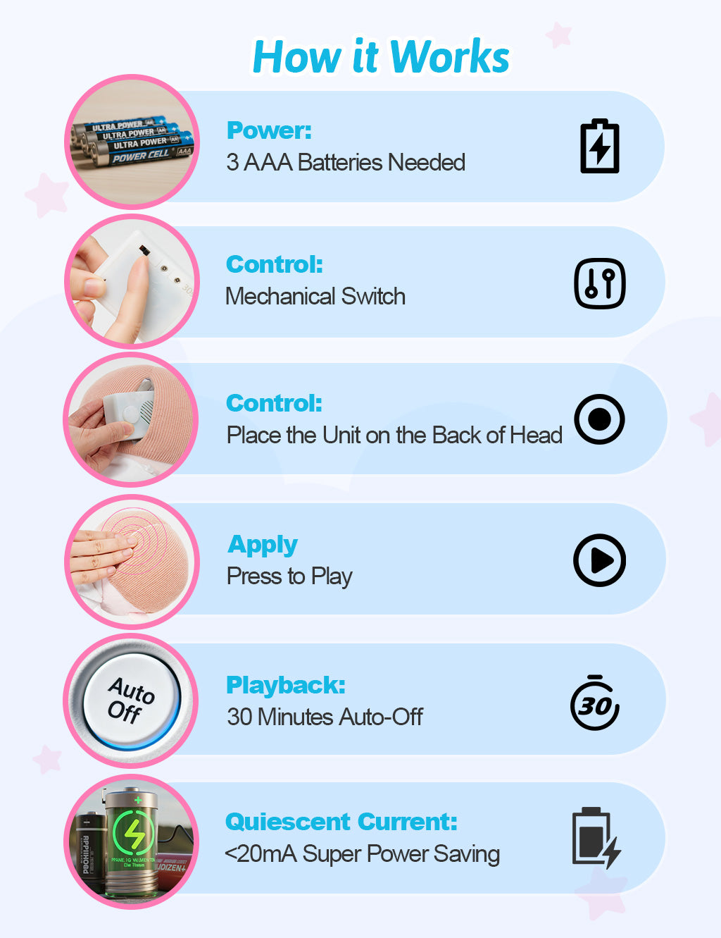 Designed for real life, Uni is incredibly easy for parents to use and safe for babies to love. A gentle press on Uni's back of head plays 30 minutes of soothing sound, helping your baby drift off effortlessly. Runs on common AAA batteries. Plus, the sound unit is easily removable for a stress-free machine wash.