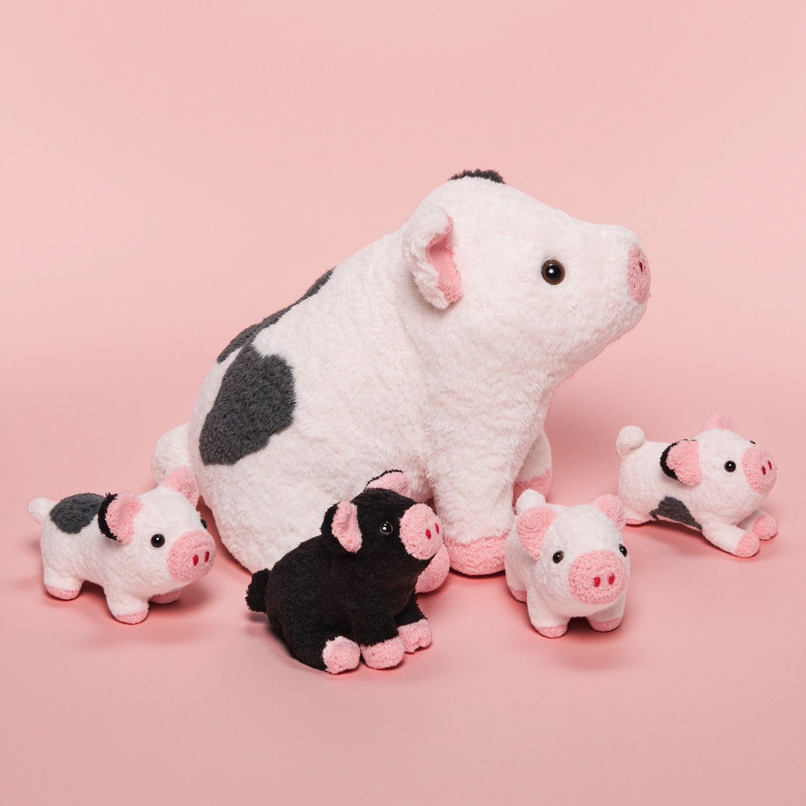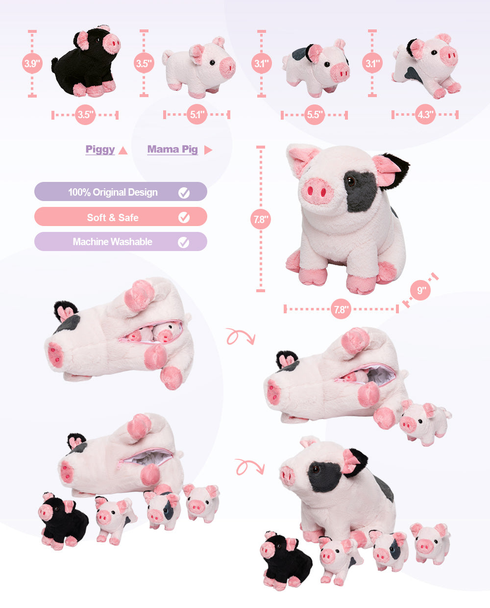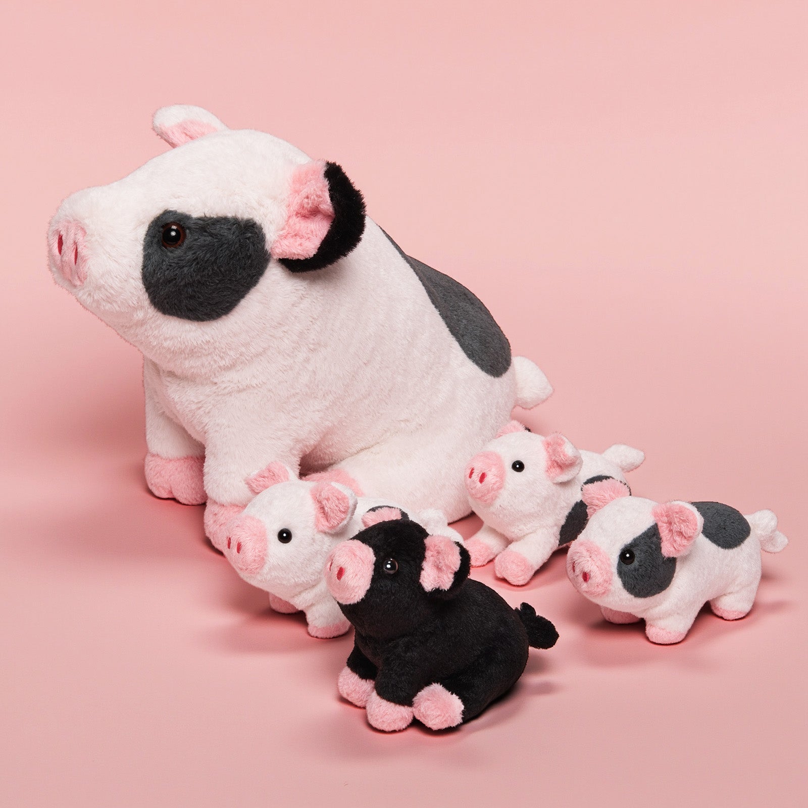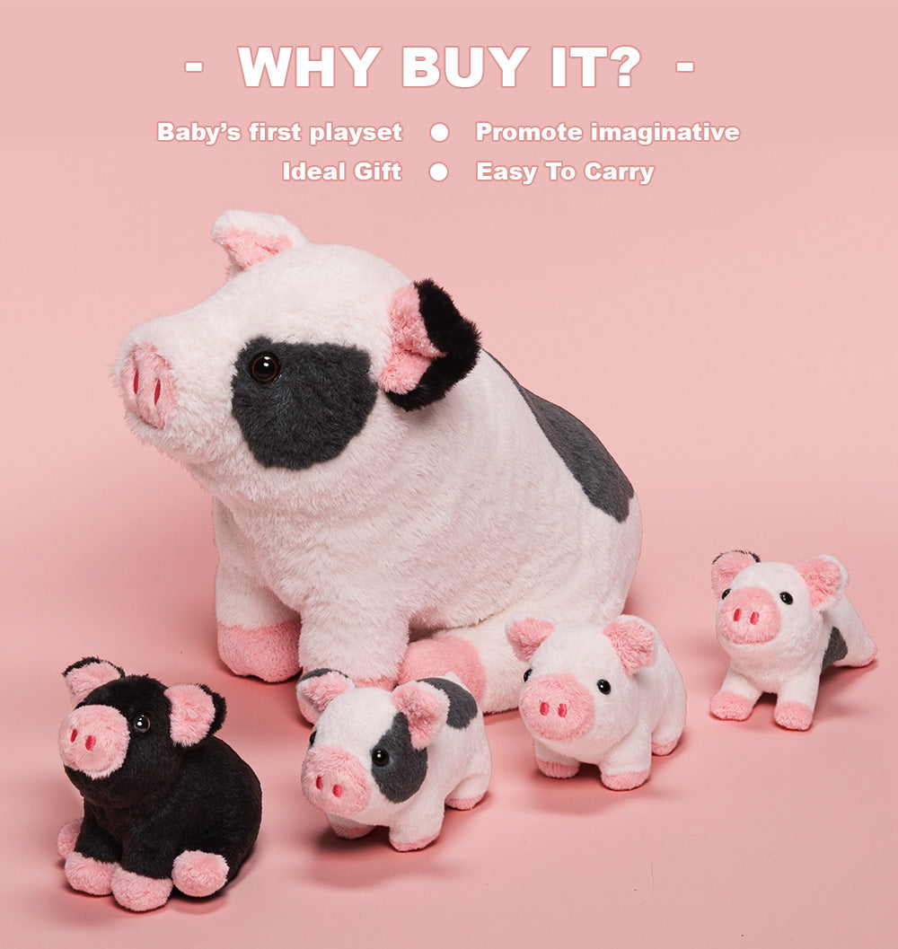 This plush toy set comes with a 20 cm plush spotted pig and four cute piglets in different colors: light pink, black, a lying spotted piglet and a standing spotted piglet. Each cute piglet has different colors and expressions.