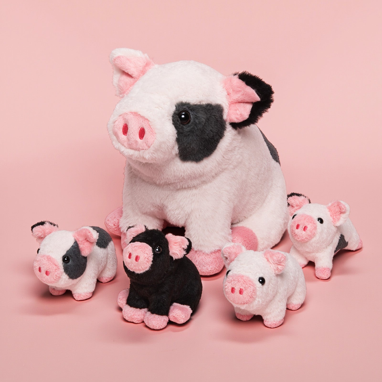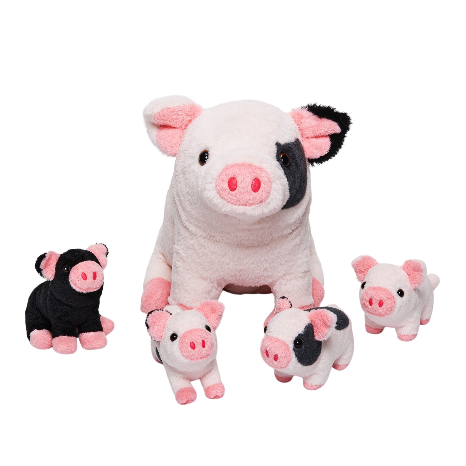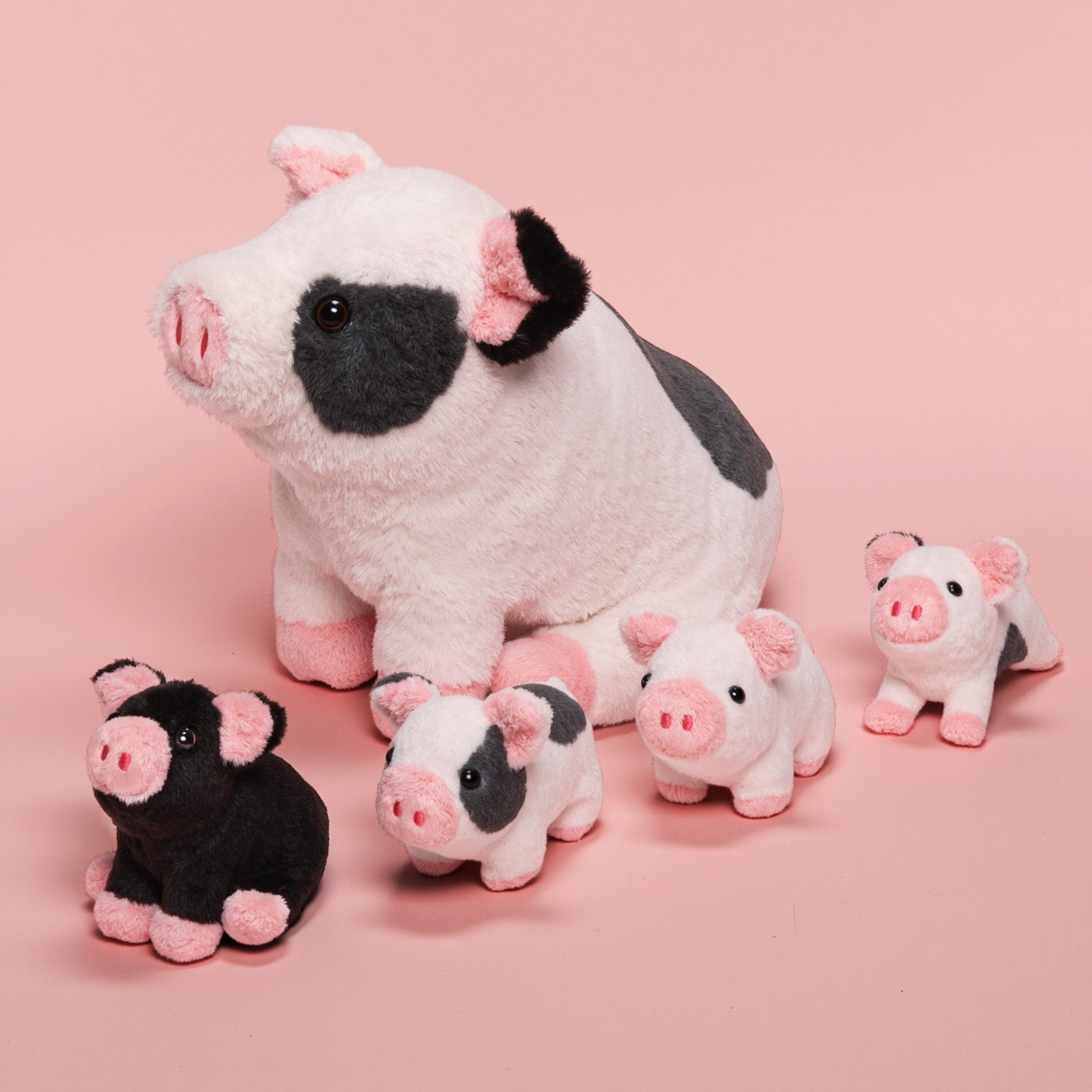 This plush toy set comes with a 20 cm plush spotted pig and four cute piglets in different colors: light pink, black, a lying spotted piglet and a standing spotted piglet. Each cute piglet has different colors and expressions.