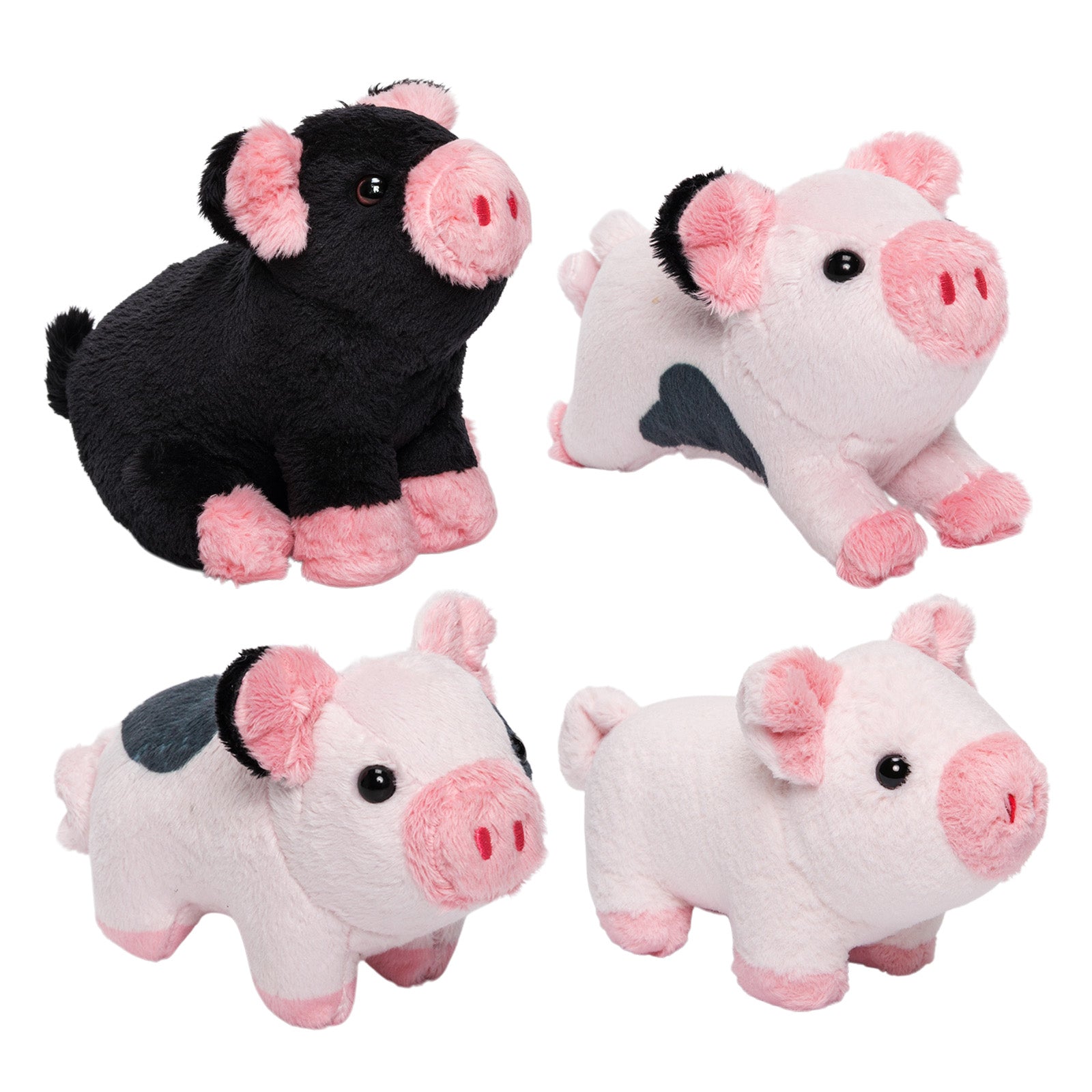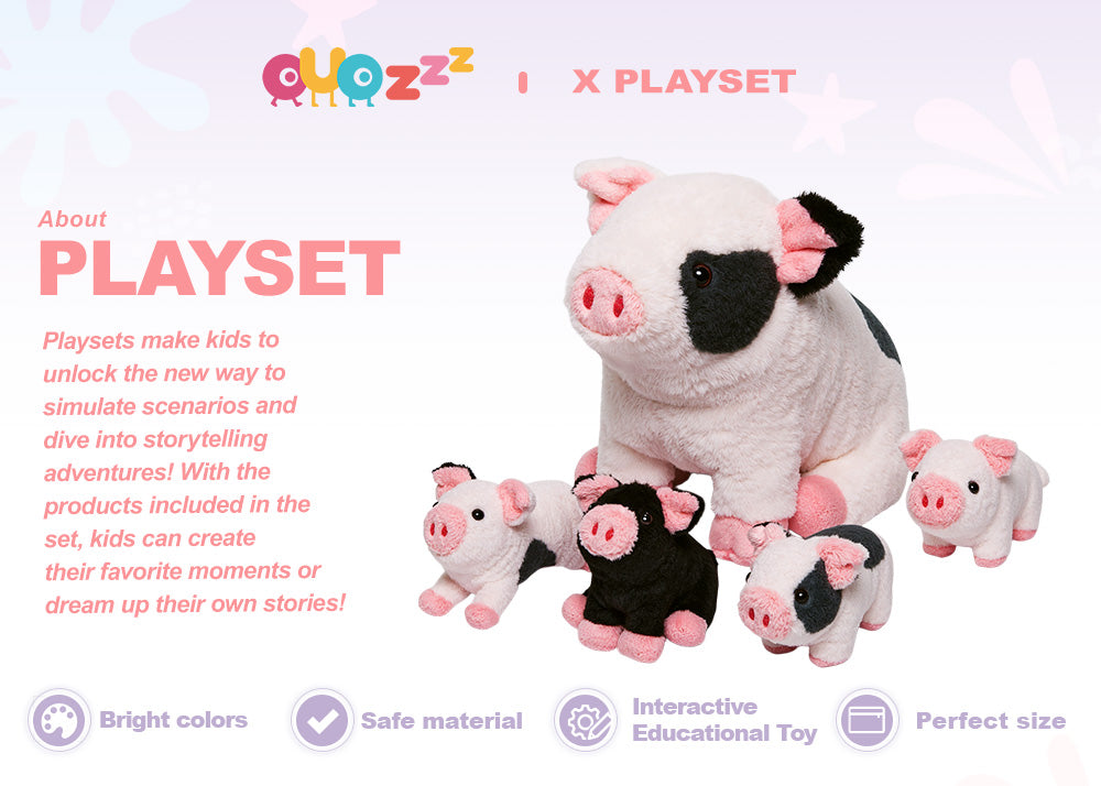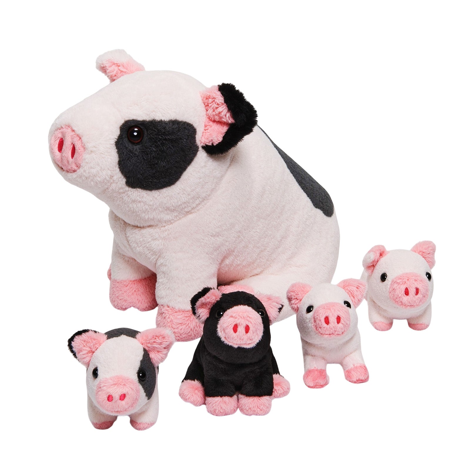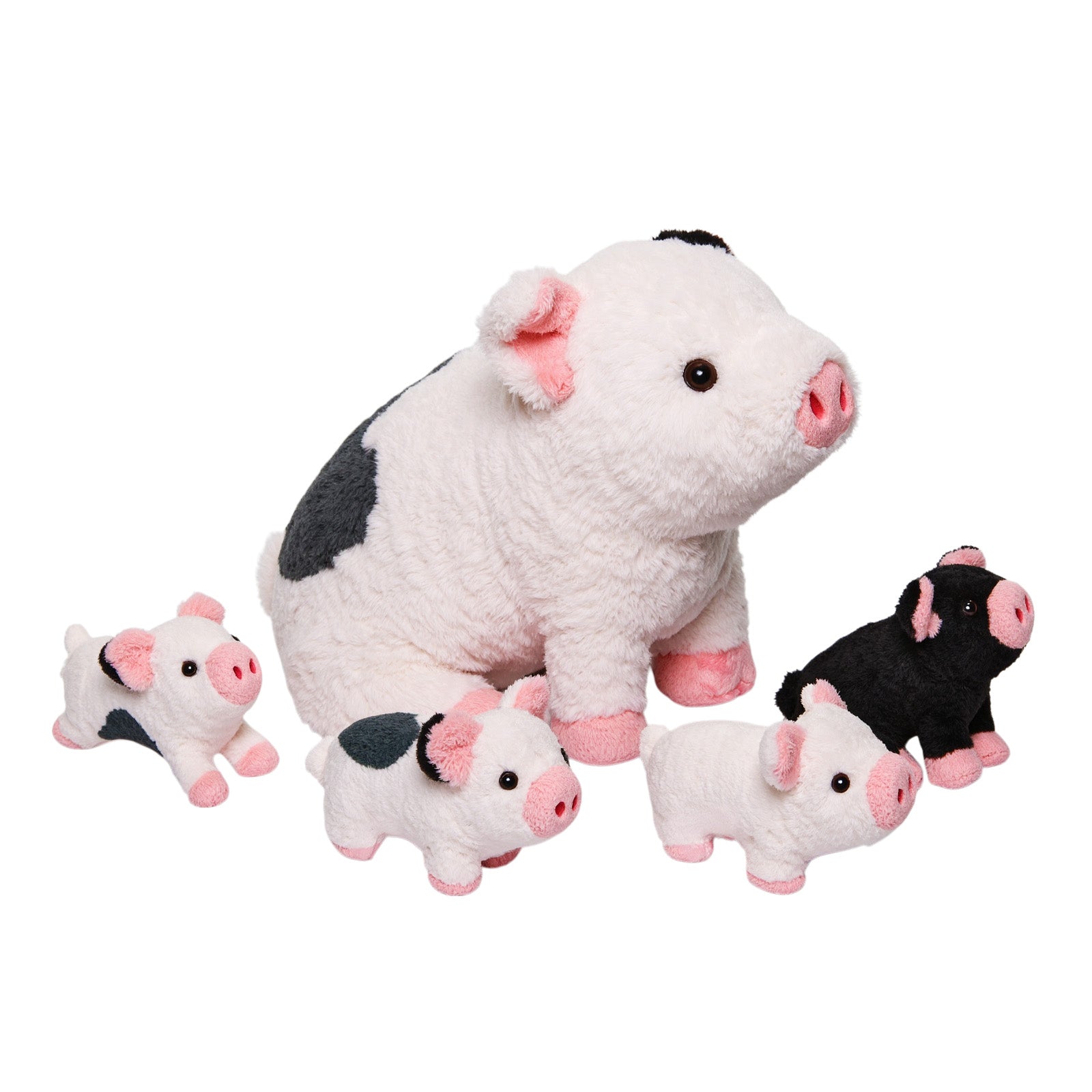 This plush toy set comes with a 20 cm plush spotted pig and four cute piglets in different colors: light pink, black, a lying spotted piglet and a standing spotted piglet. Each cute piglet has different colors and expressions.